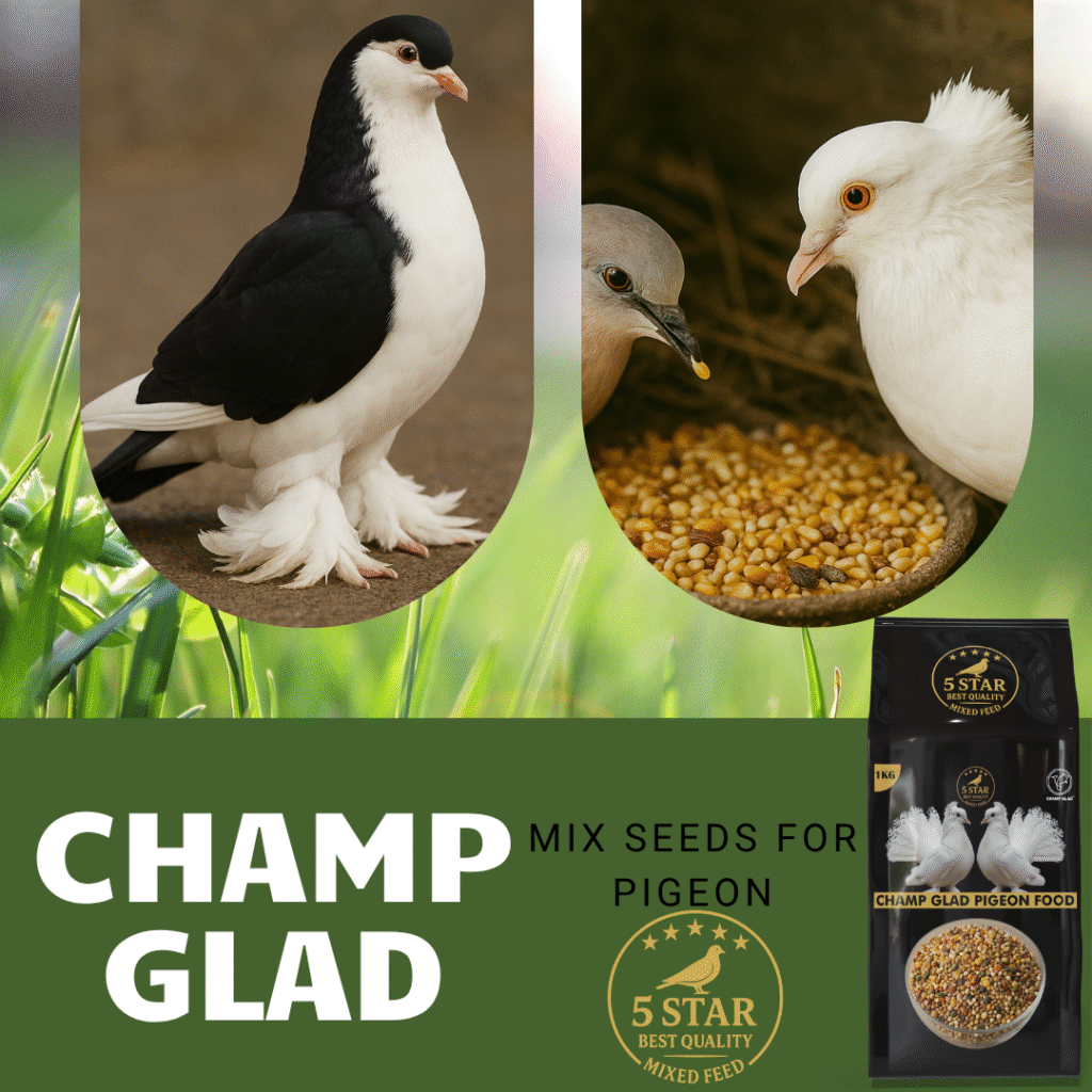 A premium mixed seed blend, like CHAMP GLAD, ensures your pigeons get all essential nutrients in one bowl.