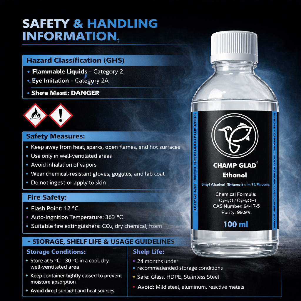 CHAMP GLAD Ethanol is a high-purity ethyl alcohol (≥99.9%), specially processed for laboratory, research, and industrial applications. It delivers excellent solvency, fast evaporation, and consistent performance.