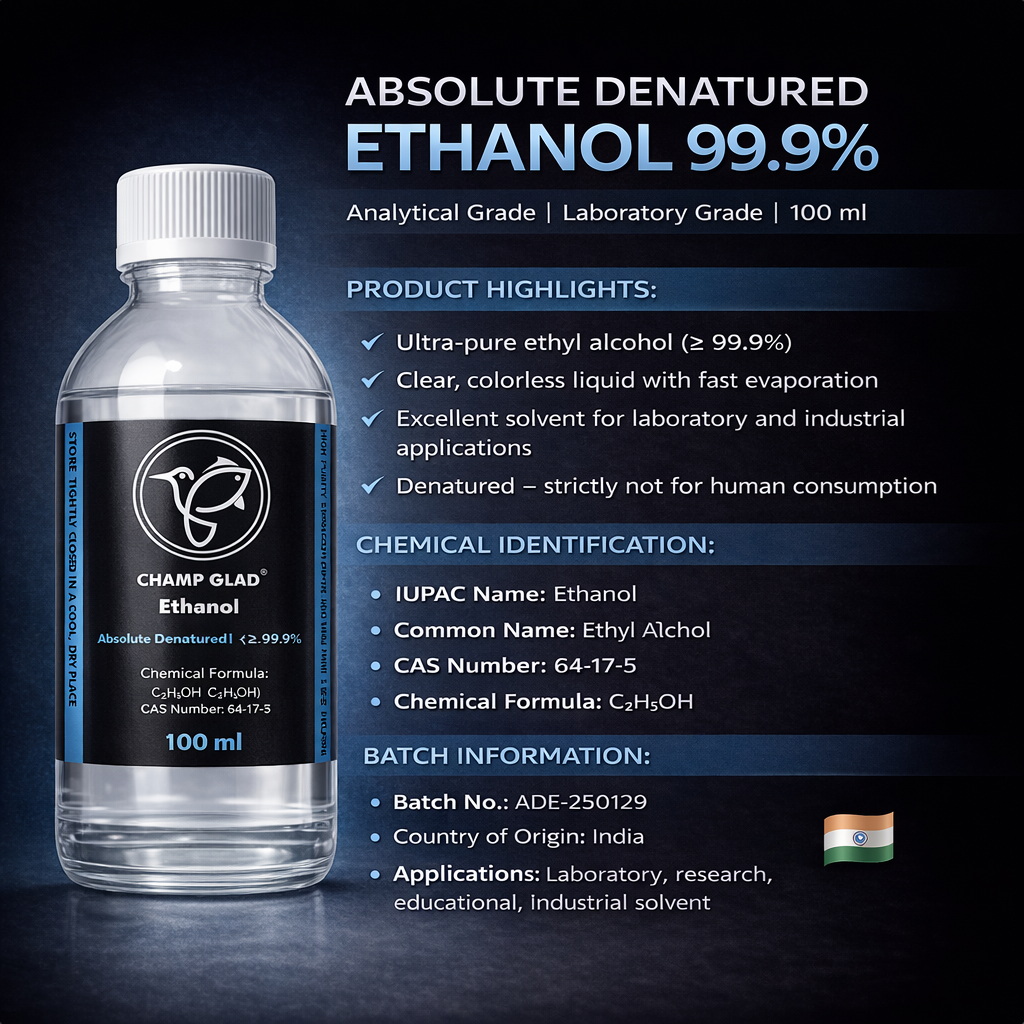 Be the first to review “CHAMP GLAD Ethanol 99.9% Pure | Analytical & Laboratory Grade Ethyl Alcohol | 100 ml Pack of 2”